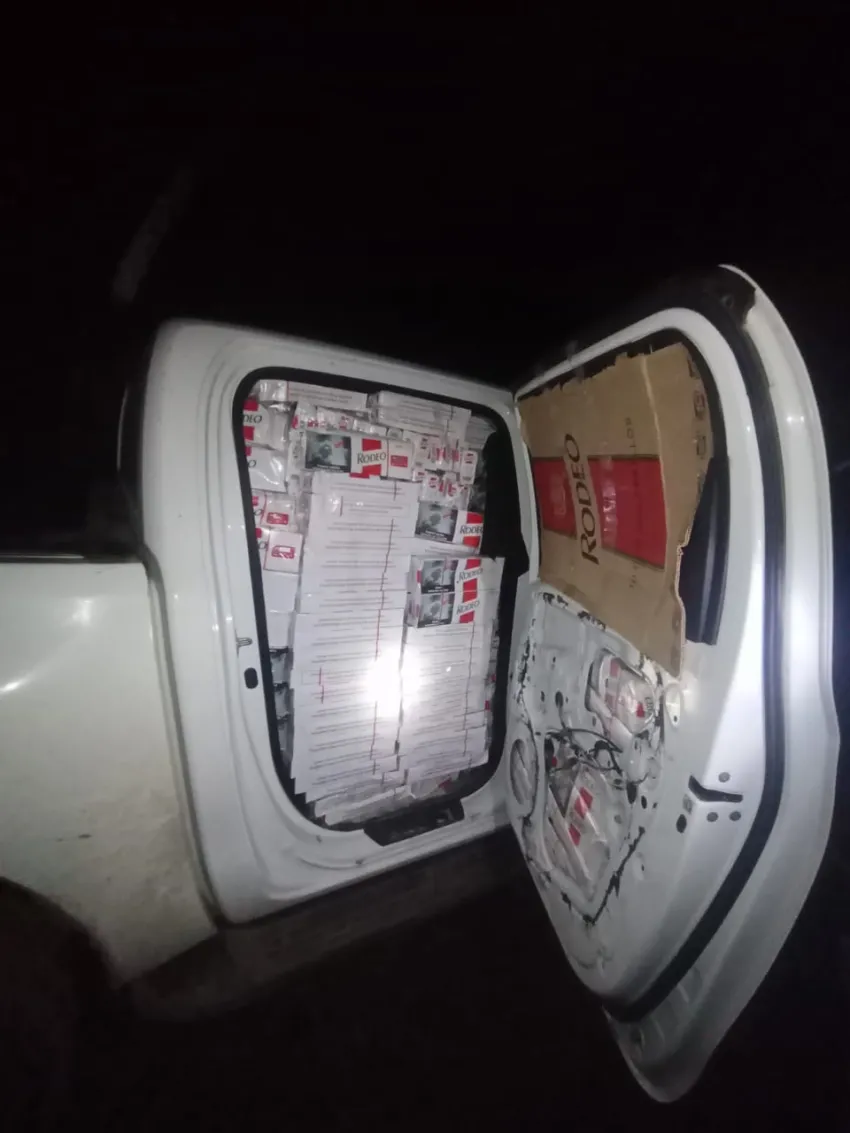 Las puertas del rodado estaban abiertas y se constató que en la caja tenía una gran cantidad de cartones de cigarrillos de procedencia extranjera, presumiblemente ingresados por pasos fronterizos no habilitados y sin aval aduanero.