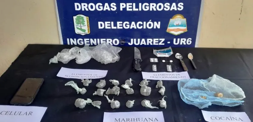 Efectivos de la Delegación Drogas Peligrosas de Ingeniero Juárez allanaron una vivienda del barrio 13 de Agosto de dicha localidad, detuvieron a un hombre y su hermana, y secuestraron 19 envoltorios de marihuana, dos de cocaína, un celular, elementos de fraccionamiento y otros elementos de interés en la causa.