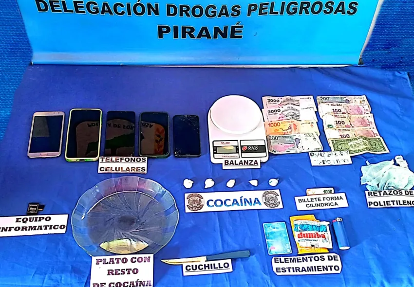 Efectivos de la Delegación Drogas Peligrosas Pirané detuvieron a dos hombres, secuestraron envoltorios de cocaína, celulares, pesos y dólares, una motocicleta y otros elementos que confirman la actividad ilícita.