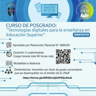 A través del Sistema Institucional de Educación a Distancia (SIED-UNaF), la Universidad Nacional de Formosa realizará un curso de posgrado titulado "Tecnologías digitales para la enseñanza en Educación Superior".