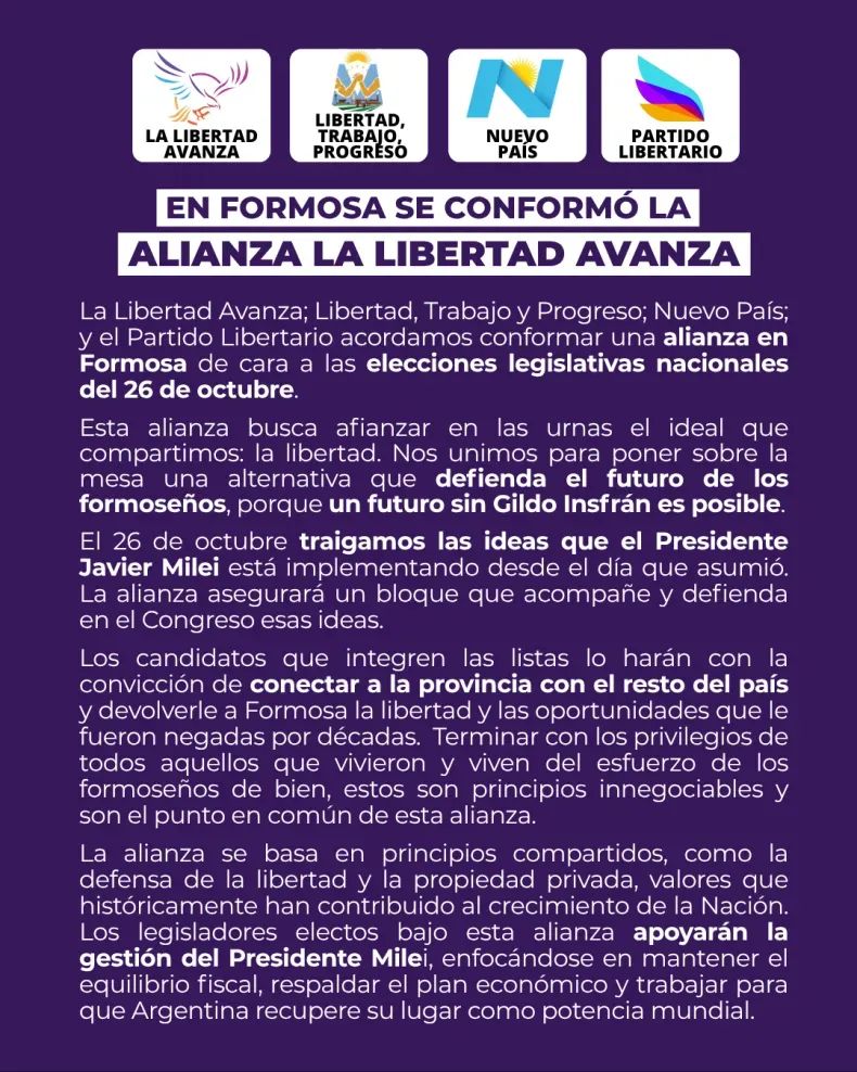 Los partidos La Libertad Avanza; Libertad, Trabajo y Progreso; Nuevo País; y el Partido Libertario acordaron conformar una alianza en la Provincia de Formosa de cara a las elecciones legislativas nacionales de este próximo 26 de octubre. De esta manera, se unen los espacios políticos más votados el pasado 29 de junio.