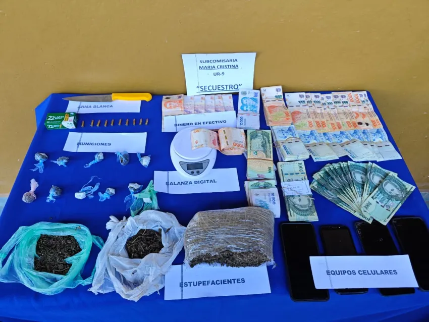 Allí se secuestró una bolsa de polietileno cargada con una sustancia vegetal compatible con marihuana, más envoltorios adicionales de la misma sustancia, dinero en pesos y guaraníes por unos cuatro millones en la cotización de la moneda local, arma blanca, 50 municiones calibre 22, balanza digital y equipos de telefonía celular.