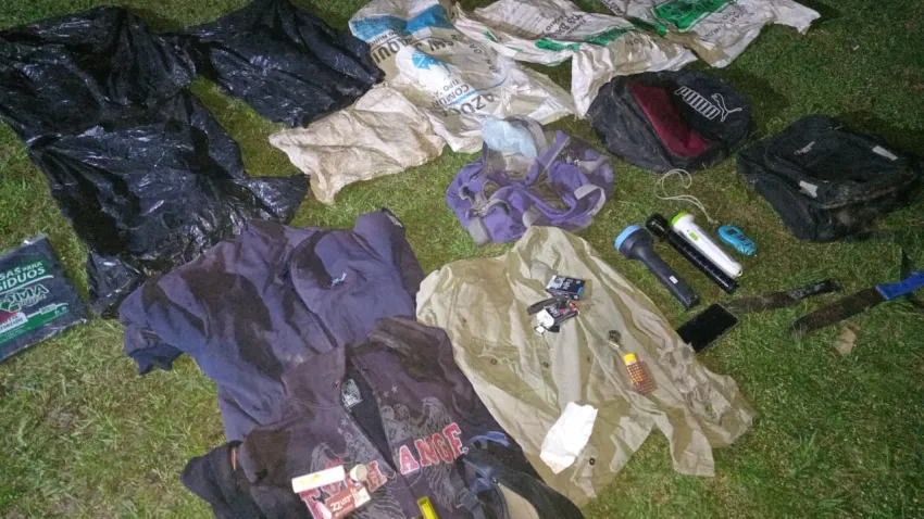 Después los delincuentes huyeron amparados por la oscuridad y la densa vegetación; mientras que los policías hallaron un animal vacuno en proceso de faena, con una paleta despostada y colgada, junto a varios elementos utilizados para la actividad delictiva: cuchillos, bolsas arpilleras, linternas, mochilas, 32 cartuchos calibre 22, una balanza digital, un teléfono celular, una llave de moto, prendas de vestir y otros elementos de interés.